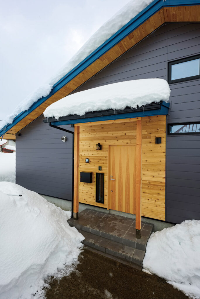 玄関まわりはマツ材を張った外壁仕上げに。重さに強い構造体と屋根から雪が落ちにくい素材を施した「耐雪型住宅」で、雪下ろしの負担も軽減