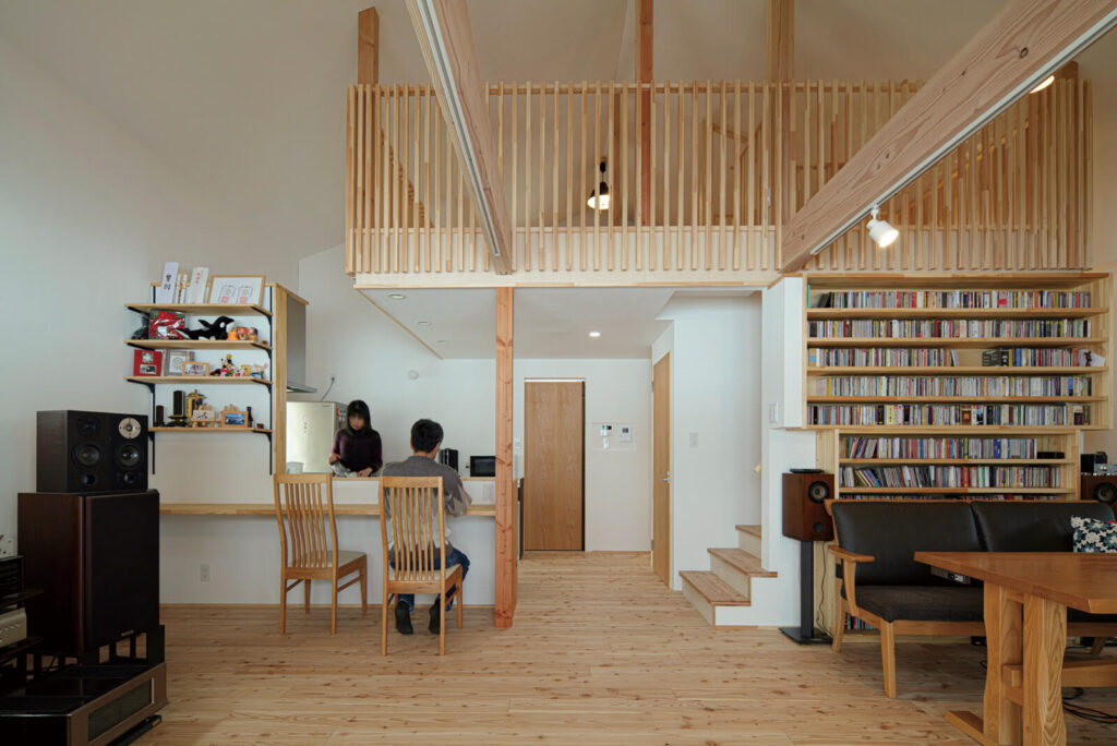 アカマツ材で造作した欄干が美しい広々としたロフトは、コンパクトな住まいで重宝する余剰空間。ログハウスに憧れていた奥さんの希望で、家には木材をふんだんに使用している