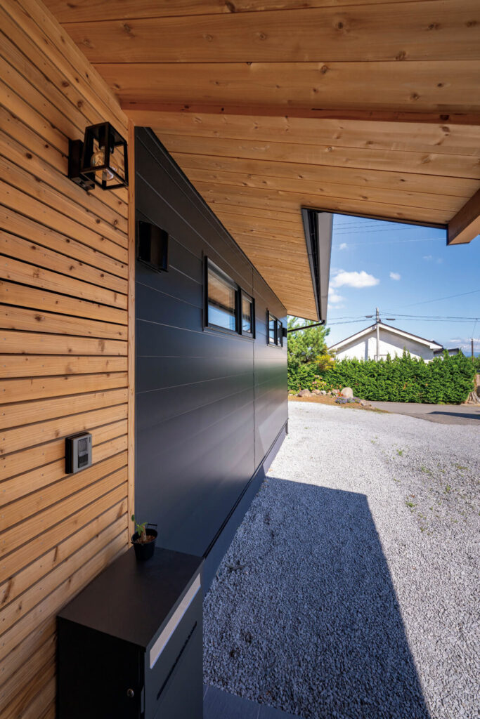 黒のガルバリウムを鎧張りし、アクセントに屋久島地杉をあしらった落ち着いた佇まいの外観。内部には耐水・対光性のシートを貼っているので丈夫
