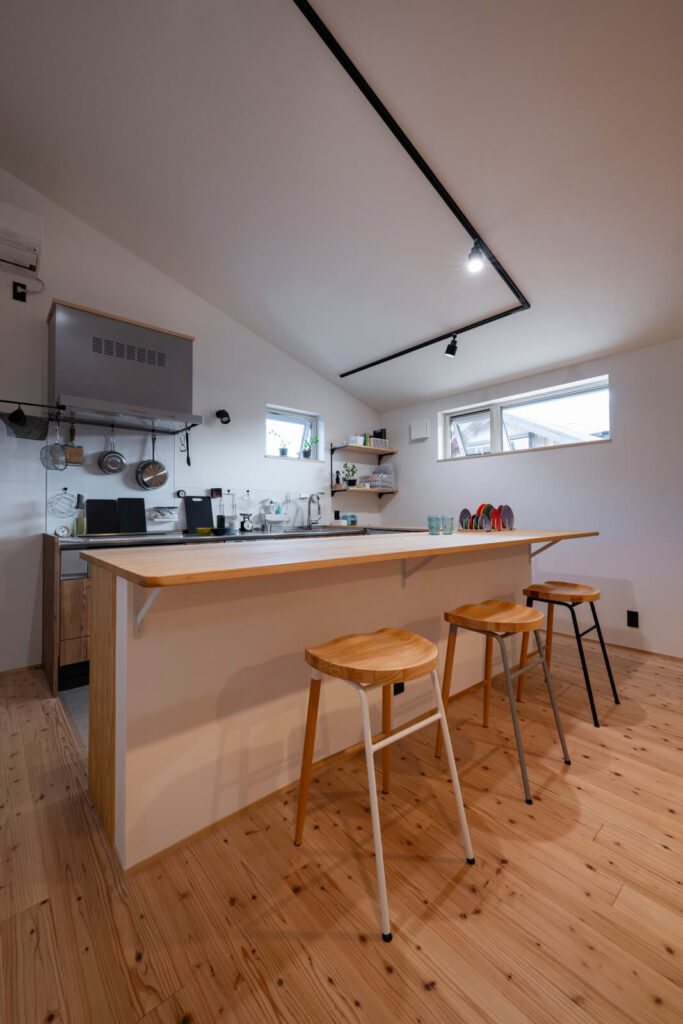奥さんの希望で壁付けタイプにしたキッチンと造作カウンターでコの字型に。ホワイトアッシュ材を使用した約1m幅のカウンターは、作業台や収納棚、ダイニングテーブル、学習机を兼ねている。収納スペースは目的を明確にすることで最小限にとどめ、居住空間を可能な限り広げている
