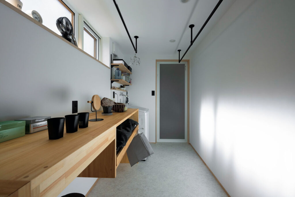 水まわりも区切らず一体化した空間に。タオルや家族の下着はカウンター下の棚にまとめているので、取り出すときも収納するときも便利