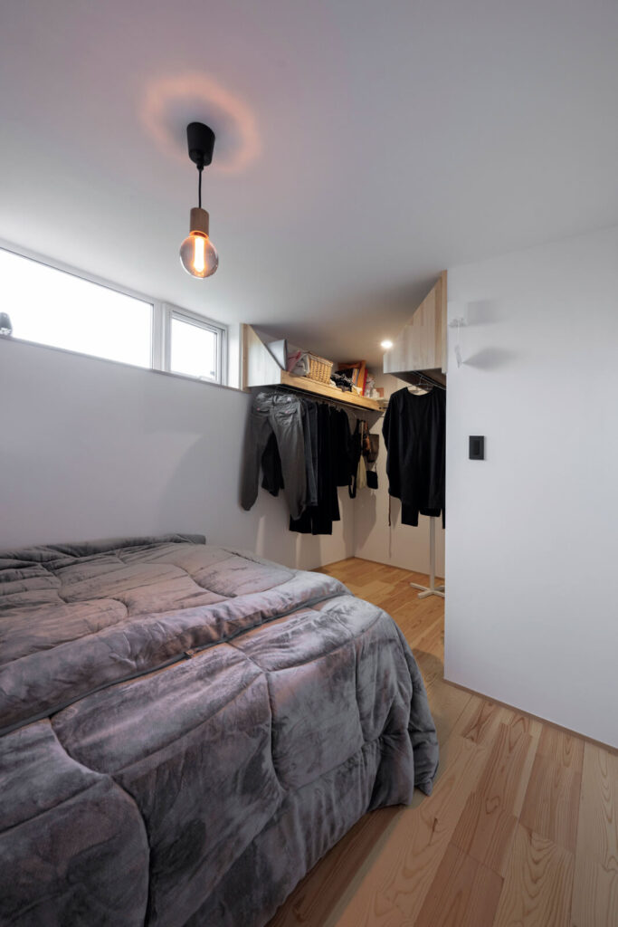 寝るためだけの部屋と目的を割り切った約5帖の寝室。床にはやわらかさと温かみを感じさせる長野県安曇野産のマツ材を使用している