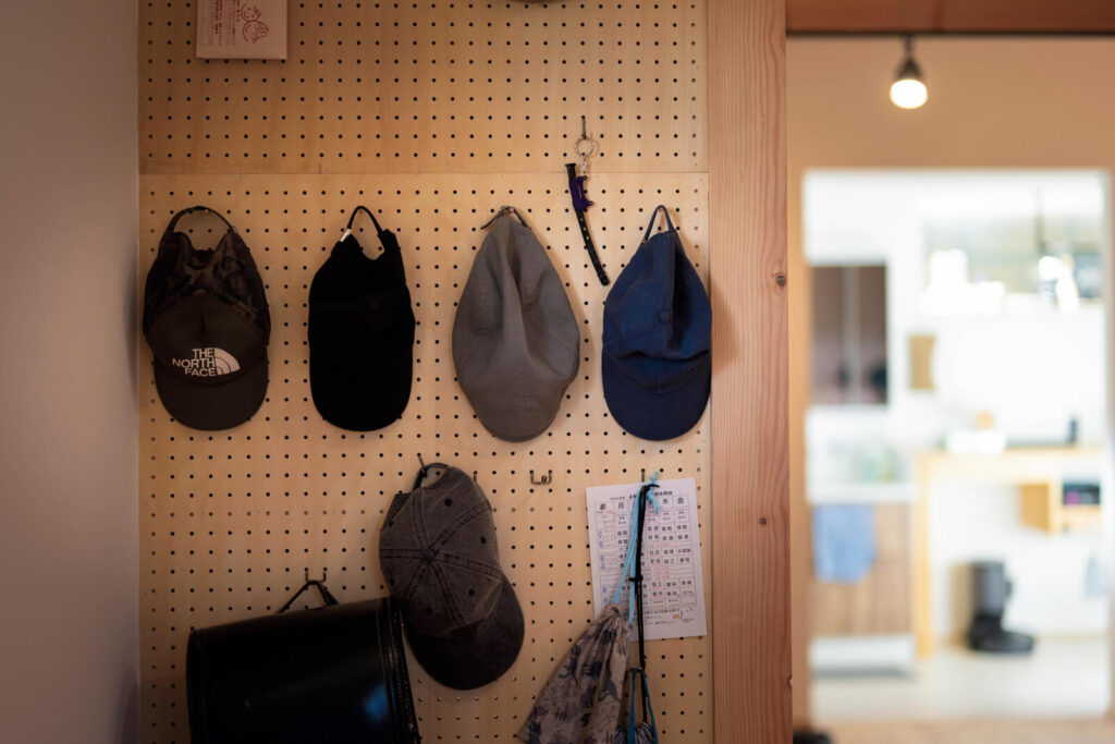 髙山建築からの提案で、リビングとキッチンの間の壁には有孔ボードを使用。見せる収納としても機能している