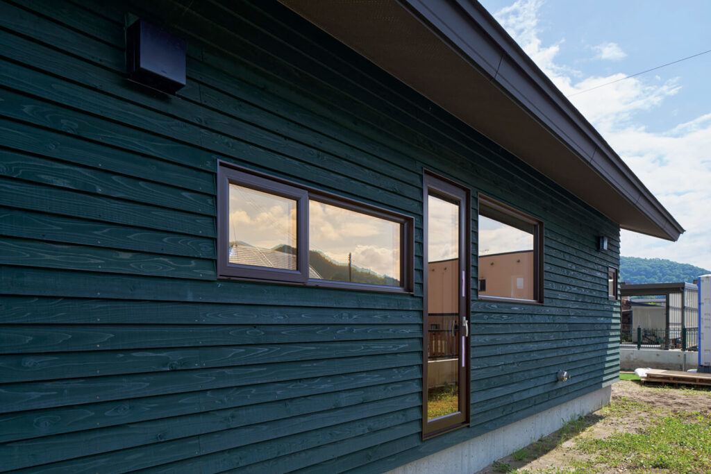 Aさんが「花色が映える」と選んだ深いグリーンのスギ下見板張り外壁と三角屋根が、ナチュラルな雰囲気を醸し出す平屋の外観。防腐効果のある塗料で仕上げた外壁は、傷んだ材のみを交換でき、アフターメンテナンスが容易