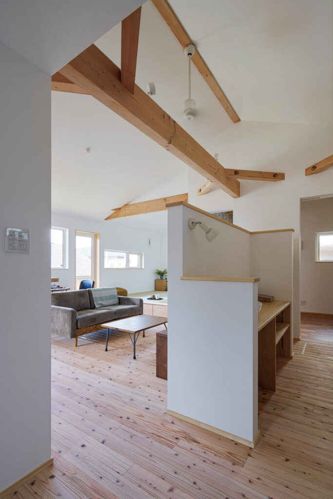 勾配天井と現しの梁、そしてピクチャーウインドウが、明るく開放的なくつろぎ空間をつくり出すリビング。浮造り仕上げのスギ無垢床の感触も温かく、心地よい