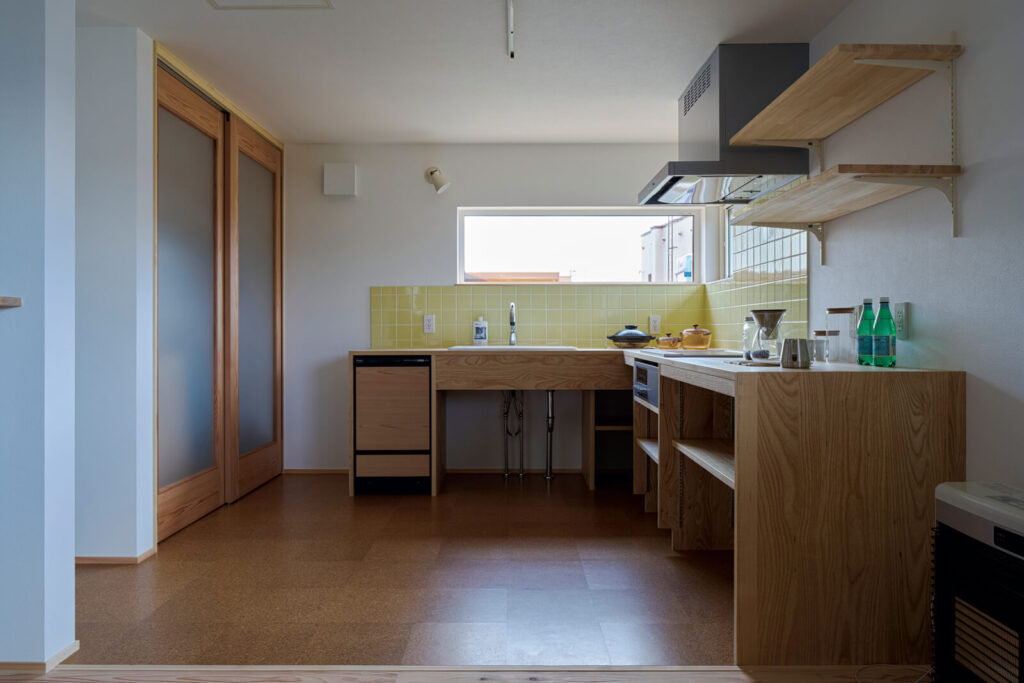 パントリーを備えたキッチンは壁付け・L字型に造作することで、省スペースと家事効率の向上を実現。床には耐水性に優れ、足触りの良いコルクタイルを採用した。窓を配することで視線が抜け、壁付けの圧迫感が軽減