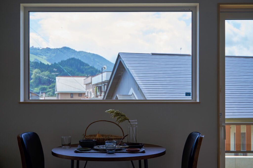 完成した新居は、延床面積約20坪のコンパクトな空間。畳コーナーを備えたLDKと寝室、水まわりが無駄のない動線で結ばれています。これから整備を進める庭や町を縁取る山並み、スキー場を一望する大きなピクチャーウインドウも設置。窓越しに遠くまで視線が抜けていくリビングは開放感抜群で、キッチンからも景色が楽しめます。「この土地の魅力は、自然豊かな眺望。その良さを最大限に楽しめるよう、開口の大きさや位置にもこだわりました」と、代表の髙山さん。