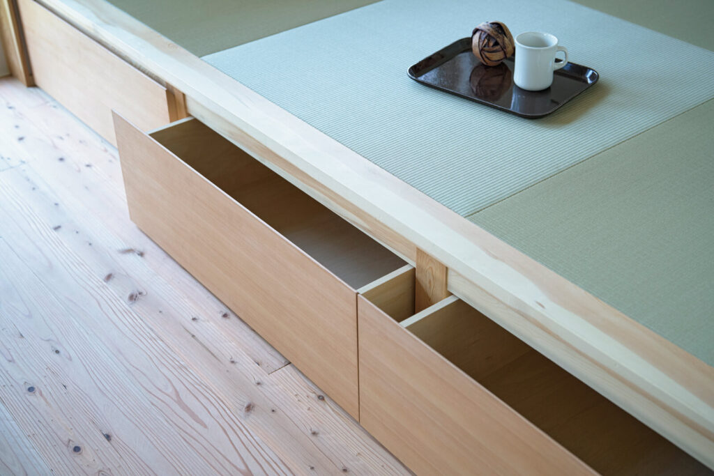 畳コーナーの床下には、引き出し式の造作収納が設けられている