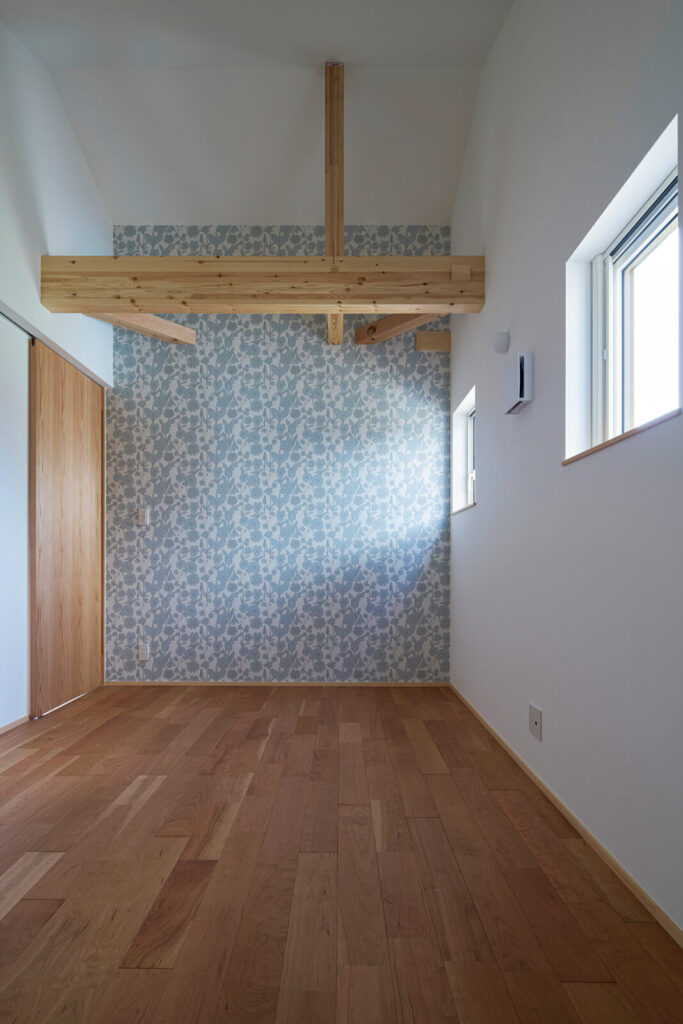 床にブラックチェリー無垢材を張った寝室。爽やかなブルーのアクセントクロスは、Aさんが選んだ。スギの突板を用いた建具も造作