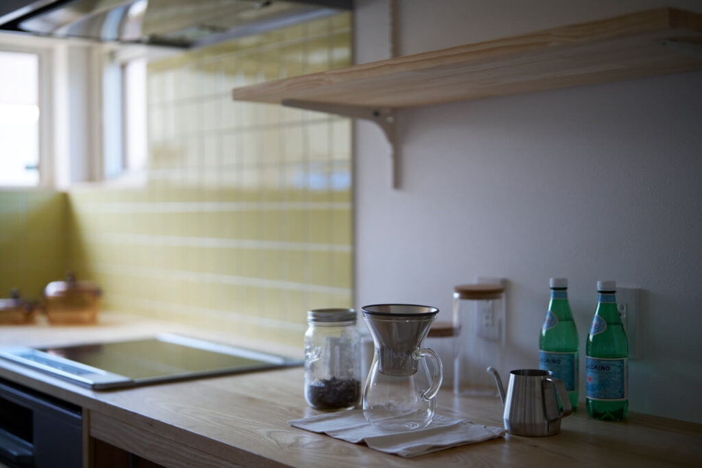 キッチンの明るい黄色のタイルは、Aさんが選んだもの。クロスやタイルなどのセレクトからセンスの良さが光る
