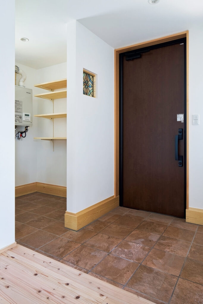 玄関には、土間続きにボイラー室を兼ねたシューズクロークを設置。間仕切り壁にはめ込んだステンドグラスは、Aさんのコレクション。施工中の変更で設けた採光窓からの光で、玄関まわりが明るくなった