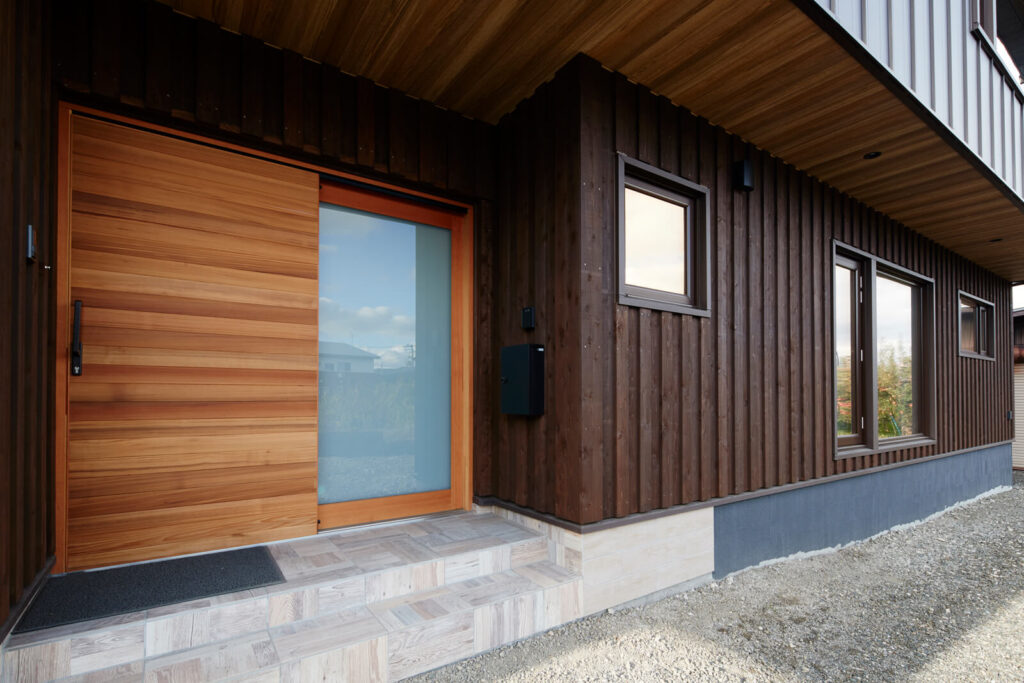 弘前市中心部の南東、りんご畑が広がる閑静な場所に立つHさんご家族とお母さんが暮らす二世帯住宅。縦張りのガルバリウム鋼板とスギ板が調和する外観が個性を感じさせます。