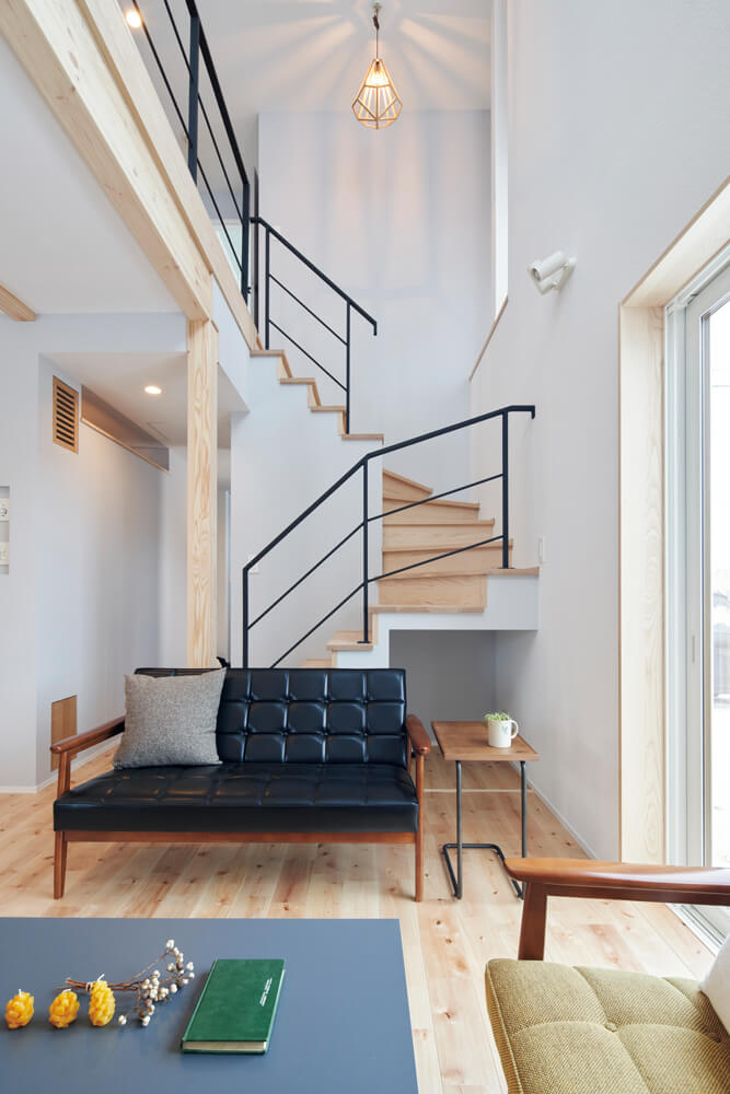 開放感の演出や採光だけでなく、空気の対流を生み、家全体の温度を均一にする役割も果たす吹き抜け。黒のアイアン手すりがアクセントに