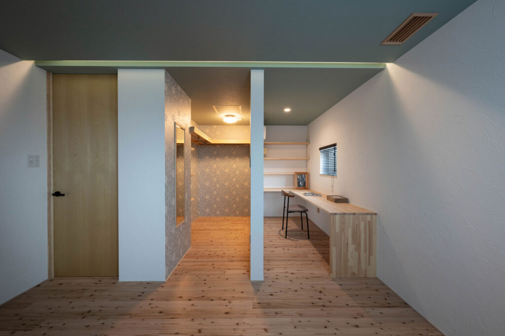 塗り壁や浮造り仕上げのスギ無垢床、木製階段、随所に設えた造作など、室内は自然素材がもたらす気持ちよさに満ちている